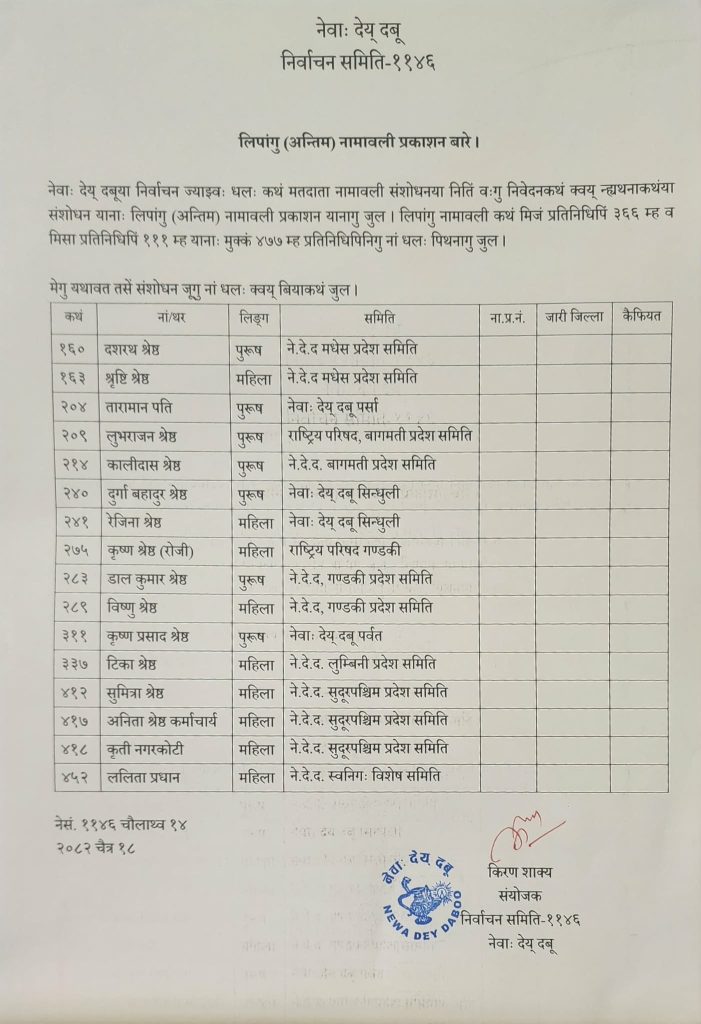 नेवाः देय् दबूया च्याक्वःगु तःमुँज्याया मतदान तालिका व प्रतिनिधिपिनिगु नां धलः प्रकाशन जुल ।